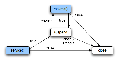 The sequence of comet servlet calls looks like the following state machine. After the initial request, the servlet spends most of its time suspended, waiting for the TimerService to call complete().
